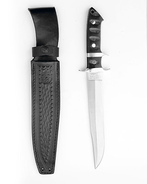TWO SMITH & WESSON KNIVES, including a subhilt dagger knife with 8 in. stainless steel blade, buffalo horn handle and black leather sheath TOGETHER with a tanto style combat knife with 8 in. black stainless steel blade, wooden handle and black leather sheath, both in their manufacturers carton (2)