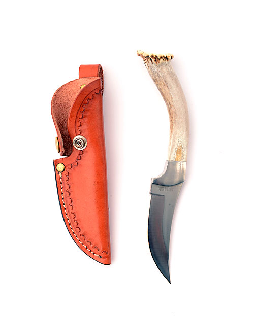 FOUR SILVERSTAG HANDCRAFTED KNIVES, including a 8 1/8 in. stainless steel bladed Pacific Bowie knife with Elk Antler handle, a 3 in. damascus bladed Gamer knife with Deer Antler handle, a 2 1/2 in. stainless steel bladed Mini Patch knife with Whitetail handle and a 3 1/2 in. stainless steel bladed Cascade Hunter knife with deer handle all complete with leather sheaths and manufacturers cartons (4)