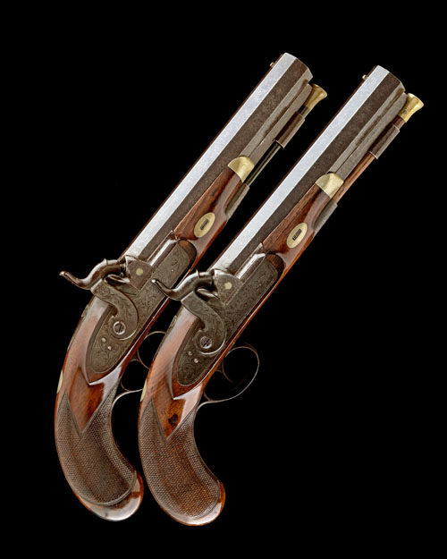 circa 1840, with heavy 8in. octagonal barrels, the top-flats signed 'LONDON', bead fore-sights, twin white-metal lines at breech, scroll engraved colour-hardened breech-blocks, scroll engraved top-tangs, white-metal plugs, borderline and scroll engraved bar action locks signed 'FORSYTH', flat-sided hammers with dolphin heads, walnut half-stocks with chequered bag-shaped butts, vacant white metal oval escutcheons to wrists, iron furniture, white metal fore-end caps and brass-tipped mahogany ramrods TOGETHER WITH a brass mounted period mahogany storage case, the interior compartmented and lined in burgundy velvet (faded and stained), parchment 'WILLIAM POWELL, BIRMINGHAM' trade-label to inside of lid and also including a nipple key and turn-screw