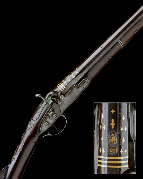 * A HADLEY, LONDON 20-BORE PERCUSSION SILVER-MOUNTED HUNTING 'FUSIL', serial no. 9988N, the mounts hallmarked for 1763 with later conversion to percussion, slightly swamped two-stage 25in. barrel with carved bands at the intersection, silver bead fore-sight applied to a silver starburst surround, triple gold lined at breech, the two side flats inlaid with six gold stars each, two further gold stars and two gold poincons inlaid to the top flat, the poincons marked 'H. HADLEY' and 'LONDON' respectively, later hooked breech, plain top-tang, curved and radiused scroll engraved lock signed 'HADLEY', engraved sliding safe behind the slab-sided hammer, walnut full-stock with floral carving around the top-tang, carved drop-points behind the lock and side-plate, large rococco escutcheon missing from the handrail wrist, silver moulded and engraved furniture including heel-plate, trigger-guard tang and bow, pierced rococco sideplate, fore-end joining plates and ramrod thimbles, complete with a horn-tipped wooden ramrod