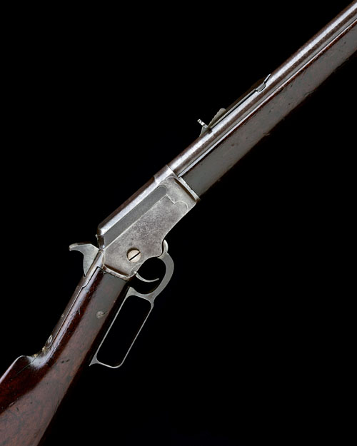for 1892, with scarce 24in. round barrel, the top signed 'MARLIN FIRE ARMS CO NEW-HAVEN CT USA' together with patent dates to 1892, dove-tailed blade fore-sight, buckhorn rearsight, plain receiver with take-down screw and sliding bolt, central hammer, no model designation to top-tang, walnut straight-hand butt-stock with iron crescent heel-plate, plain walnut fore-end and full-length pull-forward under-barrel tubular magazine, traces of finish in sheltered areas