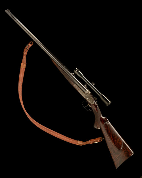 24 7/8in. replacement Bohler Spezial Stahl nitro chopperlump barrels (by Josef Hambrusch) with broad raised matt rib, two folding leaf sights marked for 100 and 200 yards and with white metal-inlaid sight lines, gold bead fore-sight, the breech end mounted with a Swarovski Habicht 4 telescopic sight in quickly-detachable mounts, action with carved fluted fences, manual bolted safety with gold-inlaid 'SAFE' detail, removable striker discs, best fine acanthus scroll engraving, retaining very slight traces of original colour-hardening, some surface discolouration, 14 5/8in. highly-figured pistolgrip stock with cheekpiece, engraved steel pistolgrip-cap, sling swivels and including chequered steel buttplate, weight 11lb. 2oz.