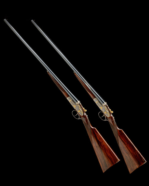 27in. nitro chopperlump barrels, ribs gold-inlaid '1' and '2' and with a gold line at the breech ends, 2 3/4in. chambers, bored approx. 1/4 and 1/2 choke, Holland & Holland patent self-opening systems, removable striker discs, automatic safeties with gold-inlaid 'SAFE' details, toplevers carved and gold-inlaid in the form of a cockerel, hand-detachable lockplates, articulated front triggers, rolled-edge triggerguards, fully engraved with flowing floral and scroll engraving, interspersed with relief engraved and gold-inlaid ribbons, flowers, mallard and pheasant, with gold line borders, the triggerguards gold-inlaid with the A C and fleur de lys, the fore-ends engraved and gold-inlaid en suite, 14 7/8in. boldly-figured stocks, weight 7lb. 1oz., in a brass-cornered oak and leather case, relined in red velvet and with Churchill trade label