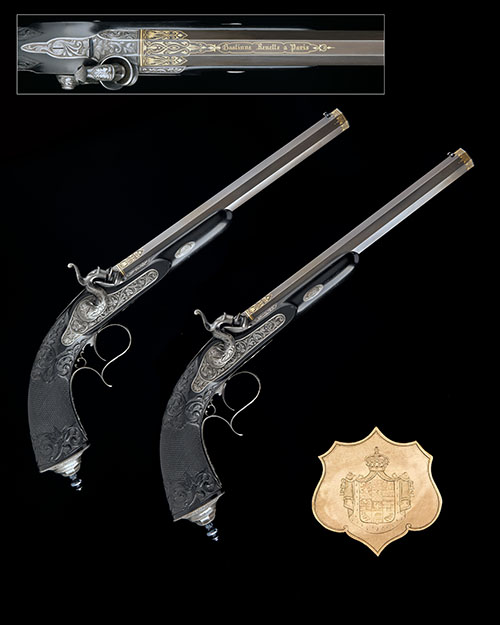 circa 1855, with browned octagonal 10in. barrels, inlaid gold bands and arabesques at muzzle, further en-suite inlays at breech, the top flats signed in gold script 'GASTINNE RENETTE A PARIS', the signatures surrounded by co-joined inlaid borders with arabesque terminals, dove-tailed bead fore-sights, standing notch rear-sights to the chisel carved top-tangs, deeply chisel-carved floral panels at breech, double scroll and fenced nipple-snails, floral chisel-carved bolsters, deeply chisel-carved isolated unsigned bar-action hump-back locks with stepped tails, en-suite hammers, ebonised wood half-stocks with chequered flared butts, relief floral and ivy-leaf carving bracketing the chequering, iron florally carved butt-caps with blued spires, spurred trigger-guard bows with carved scrolled supports and featuring the Brunswick heraldic shield inlaid in gold surrounded by carved vines, finely engraved cups for the side-nails, border-engraved take-down wedge escutcheons, plain fore-ends with no provision for ramrods, the pair retaining virtually all their original finish TOGETHER WITH their ebony storage case with variegated brass banding to the lid and a central brass engraved representation of the Brunswick heraldic shield, the case lined and compartmented in green baize in the continental style and complete with a full suite of accessories including ebony and brass-mounted loading and cleaning rods, ebony handled turn-screw and nipple-key, scissors ball-mould and powder-measure chisel carved en-suite with the pistols, an ebony loading mallet and two bayonet-lidded ebony pots