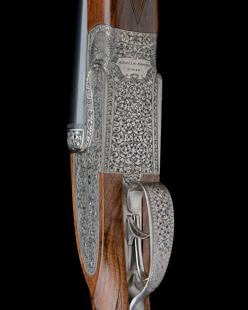 23 3/4in. nitro chopperlump barrels with matt sight rib, open sights and two folding leaf sights gold-inlaid for 50, 100 and 150 metres and with gold-inlaid sight lines, ramp-mounted bead fore-sight, the sight rib and fore-sight ramp engraved with acanthus scrollwork fore and aft, treble-grip action with hidden third bite, side-bolsters, removable striker discs, elongated top strap with automatic safety, arrow cocking-indicators, articulated front trigger, rolled-edge triggerguard, bold acanthus scroll engraving in the Holland Royal style, the underside with a cartouche engraved 'GRULLA ARMAS EIBAR', the triggerplate signed 'ABAIGAR', bright finish overall, 15in. highly-figured pistolgrip stock with cheekpiece, engraved steel pistolgrip-cap (with trap), blank gold escutcheon, semi-beavertail fore-end, weight 8lb. 9oz., in its compact leather case with canvas outer