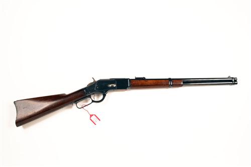 for 1904, with round 20in. barrel signed 'WINCHESTER'S REPEATING ARMS NEW HAVEN CT. KINGS IMPROVEMENT PATENTED MARCH 29 1866 OCTOBER 16 1860', block and blade fore-sight, elevating ladder 'carbine' rear-sight, plain receiver with sliding dust-cover and side-mount for saddle-ring (ring missing), top-tang marked 'MODEL 1873', walnut straight-hand butt-stock with iron 'carbine' heel-plate fitted with sliding central trap-door, brass cartridge-lifter with calibre designation, plain walnut fore-end with single iron barrel-band under-barrel full-length magazine the whole refinished