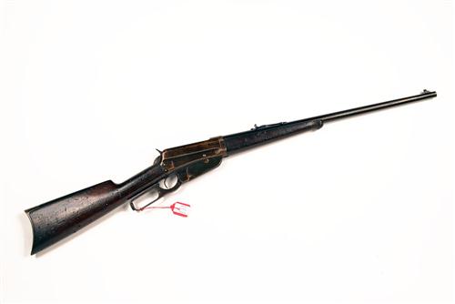 for 1915, with blued 24in. tapering barrel marked 'NICKEL STEEL BARREL ESPECIALLY FOR SMOKELESS POWDERS', matted surface to the nocksform, plain receiver marked 'MANUFACTURED BY THE WINCHESTER REPEATING ARMS CO, NEW HAVEN CONN' together with patent dates to 'August 8 07', the top-tang marked 'MODEL 1895 WINCHESTER TRADE MARK REG IN US PAT OFF', walnut straight-hand butt-stock with iron crescent heel-plate, integral box-magazine beneath the receiver, schnabel splinter fore-end with ebony inlay at tip, the whole retaining a good amount of original finish