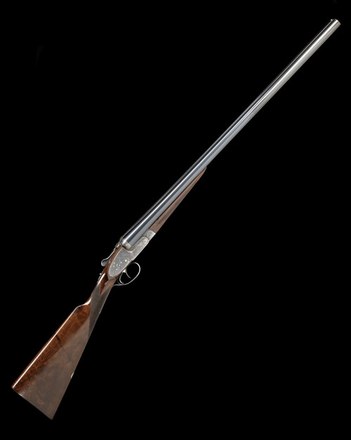 28in. nitro reproved (in 2014) chopperlump barrels, 2 3/4in. chambers, bored approx. 1/4 and 1/2 choke, engraved arcaded fences, removable striker discs, automatic safety, gold-inlaid cocking-indicators, rolled-edge triggerguard, acanthus scroll engraving, retaining much original colour-hardening and finish, 14 3/4in. stock, weight 6lb. 8oz.