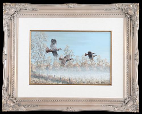 a set of two original acrylic on board signed by the artist showing partridges in flight in an autumn setting, mounted in an antique type gilt frame