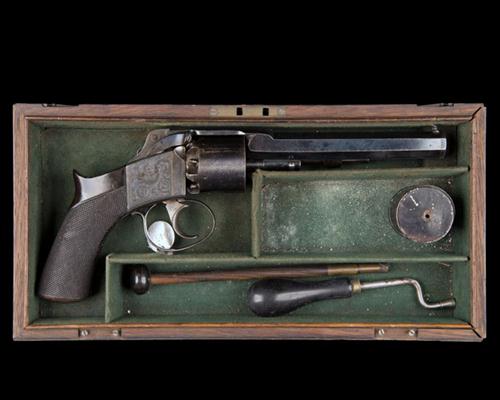 circa 1848, with blued octagonal 6in. barrel signed on the top-flat 'WESTLEY RICHARDS 170 NEW BOND ST LONDON (PATENTEE)', dove-tailed pillar and bead fore-sight, notch rear-sight to the back of the solid top-strap, engraved band at muzzle, plain blued cylinder with adjustable star, angled nipples and hammer safety notches, border and scroll engraved colour-hardened slab-sided receiver with semi-concealed hammer and quick-release mechanism for the barrel and cylinder, scroll engraved top-tang, semi saw-handled finely chequered walnut grip, iron grip-cap with scroll engraved central trap-door for caps and ratchet lever operated rammer mounted on left hand side of barrel, the whole retaining virtually all its original finish and appearing unfired complete with its Small Arms School Corps weapon collection identification tag, TOGETHER WITH its makers oak case (lid and hinges missing), compartmented and lined in green baize and containing a laquered tin of lubricated bullet-patches, a special crank-handled nipple-key and mahogany cleaning rod