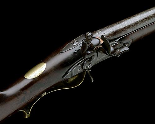 for 1823, with deeply rifled 30 1/4in. barrel marked at breech '32', applied nickel blade fore-sight, rear-sight with one standing and one folding leaf, plain top-tang with pointed tail, flat, slightly curved bevel-edged borderline engraved lock signed 'SILVESTER', stepped-tail, roller-bearing to the frizzen-spring, walnut straight-hand full-stock, raised cheek-piece, brass furniture including rectangular patch-box to the right hand side of butt, trigger-guard bow with raised finger-spur and serpentine side-plate, ramrod channel with expansion slot, iron swivels and replacement iron ramrod (from a Brunswick Rifle), some old drying splits to wood, ramrod thimbles worn