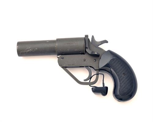 A 1in. SIGNAL PISTOL SIGNED A. UBERTI, serial no. 2150, recent, iron construction, break open 5 1/4in. barrel, phosphated finish and chequered plastic grips