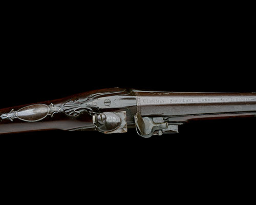 circa 1775, with round swamped 36in. barrel, the tapering flat sighting plain signed 'CLEMMES SHUG LANE LONDON SUCR. TO BARBAR' (possibly refreshed) and terminating in an engraved tear-drop, applied fore-sight bead with tear-drop apron, hooked breech with engraved top tang and shallow sighting groove, London proofs and makers stamp 'WS', gold-lined touch-hole, bevel-edged stepped tail lock (pitted, signature obscured), walnut two-piece hand-rail full-stock with carved apron and shell around the top-tang, iron oval escutcheon to wrist with acanthus foliage terminals, iron heel-plate (engraving refreshed), iron trigger-guard and bow with acorn finial, twin iron face-plates at the fore-end join, turned thimbles and possible original ramrod