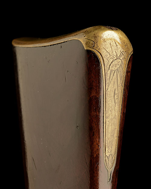 circa 1795, with two-stage 36in. barrel banded at the intersection, small squared fore-sight, possibly for a bayonet, no provision for rear-sight, hooked breech with engraved ball-band, private proofs and makers mark 'R' surmounted with a crown, engraved top-tang with shallow sighting groove, slightly curved bevel-edged borderline engraved step-tailed lockplate signed 'J. & W. RICHARDS', borderline engraved frizzen, frizzen-spring with large roller, walnut three-quarter stock with possible later chequered panels, brass furniture including moulded sideplate, iron swivels and iron ramrod