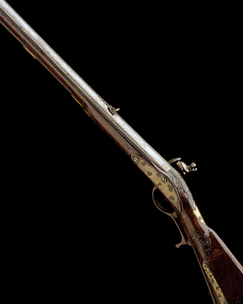 Bohemian, circa 1780, with octagonal swamped 24 1/4in. barrel signed in silver inlay 'IOHAN WISSKOUSKI IN BECHIN', concentric circle engraved to the muzzle-flat together with a lower case letter 'J', engraved ball band at muzzle, brass dove-tailed fore-sight blade with a silver inlet scroll behind, dove-tailed standing notch rear-sight with additional folding leaf and scrolled tail, further inlet silver scrolls to the squared solid top-tang and extending onto the breech area together with another engraved ball band, radiused lock with moulded edge signed forwards of the hammer 'IOHAN WISSKOUSKI', and 'IN BECHIN' to the tail, floral engraving to the tail, hammer-breast and frizzen-front, walnut full-stock carved with borders around the barrel, ramrod channel and furniture, floral carving around the top-tang, ramrod throat, finial and angular raised cheek-piece, rococo edged brass fretwork to the edge of the cheek-piece, the side-plate, the lid of the sliding patchbox at the right hand rear of butt and the brass heel-plate, rococo escutcheon marked with a similar letter to the muzzle, raised wood trigger-guard tang and bow, moulded ramrod thimbles and replacement ebony ramrod