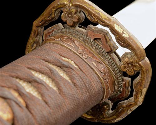 with 27 1/4in. hatchet-point blade, slightly swollen at the tip, silver 'habaki', pierced brass tsuba of General Officer quality (traces of gilding), cotton-wrapped hilt, complete with its brass-mounted, brown-painted 'saya'