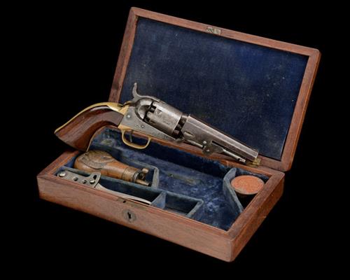 for 1864, with blued octagonal 4in. barrel (finish faded), the breech end signed 'ADDRESS COL SAML. COLT NEW-YORK U.S. AMERICA', plain cylinder with roll-engraved scene (cleaned), open iron frame, brass trigger-guard and grip-straps, smooth walnut one-piece grip and articulated under-barrel loading lever; COMPLETE WITH its American market mahogany storage case compartmented and lined in blue velvet and a number of accessories including a rare Colt Patent 'Eagle' powder flask, an Eley Bros cap-tin and an iron ball and bullet mould