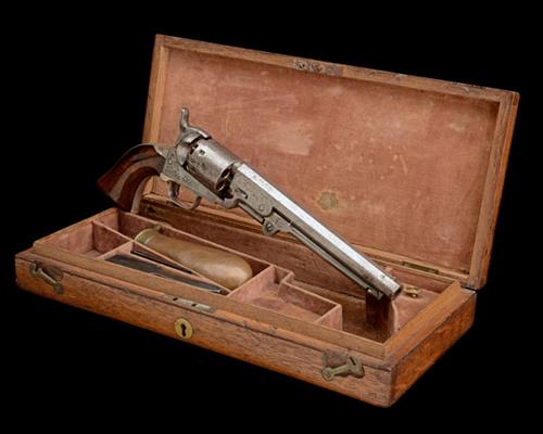for 1853, with 7 1/2in. octagonal barrel, the top-flat signed 'ADDRESS COL COLT LONDON', engraved band at muzzle, border and scroll engraving at breech, London proofs, plain cylinder with roll engraved scene, open iron colour-hardened frame with scroll engraving, scroll engraved silver plated brass back-strap and round-backed trigger-guard, smooth walnut one-piece grip, engraved hinged under-barrel rammer, the whole stripped of finish; COMPLETE WITH its manufacturers oak case, compartmented and lined in maroon velvet (faded), and including an 'L' shaped nipple key, iron ball and bullet mould and a large bag-shaped powder flask signed 'Bartram & Co.',