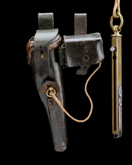 circa 1865 and including a leather bucket-type holster with soft securing flap and co-joined full-flap spare cylinder pouch, both flaps stamped 'K.M.' surmounted with a crown (some minor damage and stitching losses), the front of the holster with additional pouch containing a brass in-line capper with lanyard , the reverse stamped 'K.M. 847', TOGETHER WITH a 'COLT'S PATENT' crank-spout powder-flask embossed with a cannon in front of a trophy of flags surmounted with a crossed pair of pistols and a crossed pair of rifles, the neck of the flask stamped 'KM 389'
