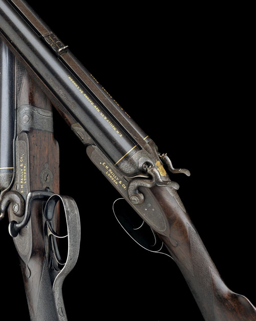 sidelever action with Purdey 1863 patent double bite, carved percussion fences, rebounding bar locks by Stanton, bar-in-wood, standing breech with fine beaded border engraving, the action, lockplates and furniture profusely engraved with fine acanthus scrolls, the top tang finely inset in gold with the crest of Alfonso XII, the lockplates gold-inlaid 'E.M. REILLY & CO. LONDON.', the triggerguard tang gold-inlaid with the serial number, retaining much original colour-hardening, 14 1/4in. well-figured stock with sling eye, blank gold oval escutcheon and including horn buttplate, weight 9lb. 1oz. (rifle barrels) and 7lb. 3oz. (shot barrels), in its fine brass-cornered oak and leather case with blue velvet lining, fully fitted to house a virtually full complement of reloading tools (some ivory-handled) by Hawkesley and Dixon, with Greenfield crimping tool and fine scroll engraved capper/de-capper and roll turnover tool with E.M. Reilly & Cie. (London & Paris) markings, the lid interior embossed in gold leaf with the makers details, the lid exterior mounted with an ornately carved and engraved frame, with central crowned monogram for Alfonso XII and brass banner pierced with 'CONCURSO DE TIRO DE 1880'