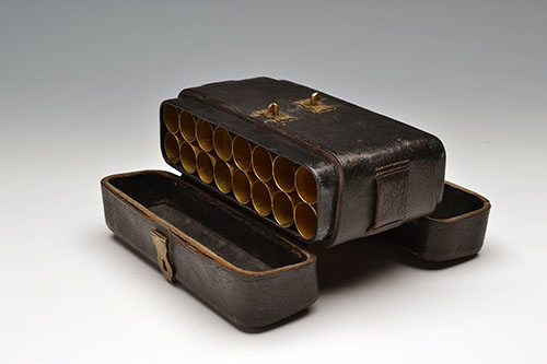 as seen in James Dixon & Sons catalogue, number 1121, with provision for 32 cartridges in total (each end holding 16), brass fittings marked with the makers details, strap missing