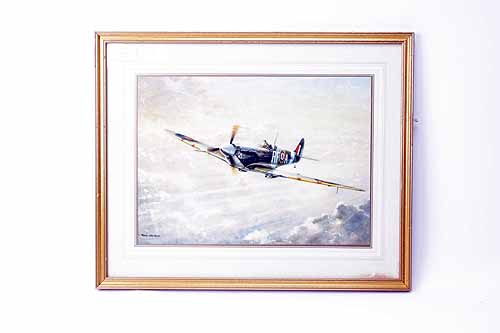 A SET OF THREE PRINTS OF WWII BRITISH AIRFORCE PLANES IN FLIGHT, including 'SPITFIRE' by Keithwoodcock, 'LONE PATROL' by Kevin Walsh, 'IN THE SUNLIT SILENCE' by Coulson