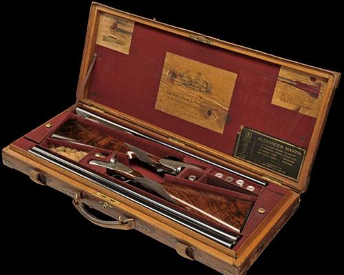 28in. replacement nitro barrels by the makers (in 1986), the ribs engraved 'BOSS & CO. 13. DOVER STREET. LONDON. W1.' and gold-inlaid '1' and '2' surrounded by flashes of acanthus scrollwork at the breech ends, 2 1/2in. chambers, bored approx. true and imp. cyl. (both), rounded bar actions, Boss improved patent single-trigger, patent no. 22894 of 26th November 1894, toplevers gold-inlaid '1' and '2', automatic safeties with gold-inlaid 'SAFE' details, gold-inlaid cocking-indicators, rolled-edge triggerguards, best fine bouquet and scroll engraving, brushed and blued finish, 15in. figured replacement stocks by the makers (in 1991), weight 6lb. 6oz. (both), in their makers brass-cornered oak and leather double guncase