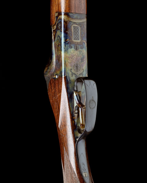 25 5/8in. (65cm) nitro barrels with matt sight-rib, open sights and ramp-mounted bead fore-sight, three-piece fore-end, scroll-back action with side-bolsters, hold-open toplever, automatic safety, gold pin cocking-indicators, set front trigger, Germanic border and scroll engraving, the underside with the Merkel trademark, retaining virtually full original colour-hardening and finish, 14 1/2in. figured pistolgrip stock with cheekpiece, pistolgrip-cap, sling swivels and including original buttplate, weight 7lb. 15oz.