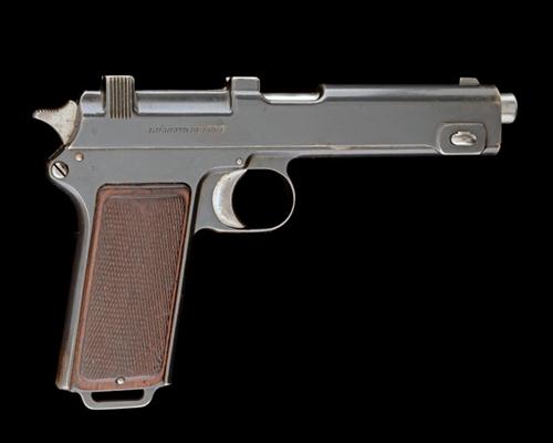 dated for 1912 and sleeved down to 7.65 from 9mm Steyr, with 5in. barrel, blued slide with charger guides and stamped with the Chilean Crest, the reverse side with 'EJERCITO DE CHILE', blued frame with integral magazine, chequered walnut grips, lanyard loop to heel, the whole expertly re-finished
