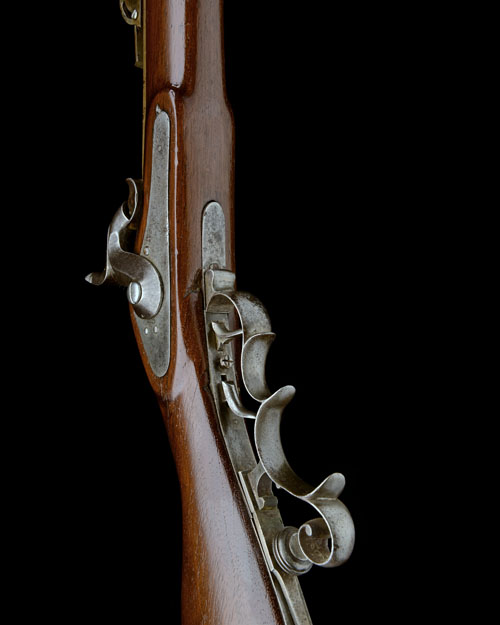 made for the Swiss circa 1850 by Beuret Freres, Liege, with round 33in. rifled barrel, dove-tailed blade fore-sight, elevating tangent rear-sight with wing-nut lock, plain elongated colour-hardened top-tang, plain hump-back lock signed 'BF', plain walnut full-stock with 'roman-nose' comb (repaired through wrist), heavy iron hooked butt-plate, reinforced trigger-guard tang, double-set triggers, finger-spur to the trigger-guard bow, iron roll-tipped nose-cap, iron under-barrel ramrod with captive sliding ball-guides, socket to the right hand side of muzzle for a bayonet and iron sling swivels