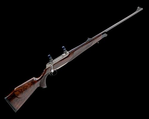 24in. nitro barrel with ramp-mounted open sights and ramp-mounted blade fore-sight, bright acanthus scroll-engraved receiver mounted with telescopic sight rings, detachable box magazine with bright finish and acanthus scrollwork, darkwood finial, highly-figured pistolgrip stock with left-hand cheekpiece and palm swell, provision for quickly-detachable sling eyes,14 1/8in. pull