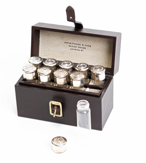 ten numbered 925 sterling silver and glass 12-bore cartridge shaped shot glasses signed 'PURDEY', fitted in a handmade suede-lined leather case