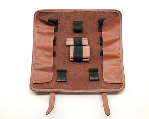 † JAMES PURDEY & SONS LTD. A NEW AND UNUSED HAND-MADE BRINDLE LEATHER SUEDE-LINED CLEANING ROLL,