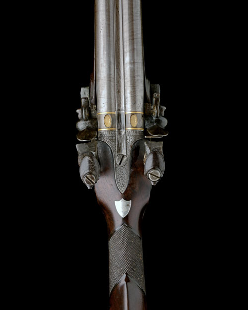 circa 1800, with twist-iron re-browned 31in. barrels, applied bead fore-sight, the breech-ends each inlaid with a gold oval poincon stamped 'BATE LONDON', twin gold lines and vents, fully engraved top-tang with a starburst bridging the join, flat, slightly curved bevel-edged step-tailed locks with acanthus carved borders and signed 'BATE', further engraving of gamebirds to the tail, en-suite hammers, semi rain-proof pans and roller-frizzens, walnut half-stock chequered at the wrist, raised cheek-piece, iron heel-plate, the top-spur engraved with a dog flushing gamebirds, large broad trigger-guard bow engraved en-suite with scrolled pistol-grip tang, pineapple finial, white metal oval barrel key escutcheons and ramrod throat, turned iron ramrod pipes and period ramrod