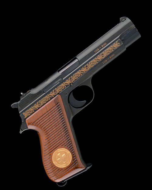 for 1999, number 102 of an edition of 500 to celebrate the 50th anniversary of the Sig P49 service pistol, with 4 1/2in. barrel, sighted slide, a Swiss-Cross within a shield inlaid in gold forwards of the rear-sight, the limited edition number picked out in gilt on the right hand side, blued frame, the guide rails engraved with gilded leaves and berries, the limited edition number repeated on the right hand side, grooved walnut grips with large medallions inlet at heel, the right bearing a Swiss-Cross, the left with a raised '50', the whole appearing unfired; TOGETHER WITH its manufacturers presentation wood two-tiered case, the top hinged tier lined in a blue with gold braid trim similar to a Swiss police-officer's uniform together with a gilt '5' and '0', the corners bearing Swiss police shoulder pips, a central compartment with the limited edition handbook and separated from the lower tray by a hinged glass panel, in turn protected by a print on card of Swiss soldiers in camouflage uniform operating in the field, the lower tray lined in a similar fashion to the upper but containing the pistol and fitted with a pierced and gilded silhouette of a Swiss police officer wielding a P49 pistol, his out-stretched arm above a rectangular panel with carved leaf and berry borders, the centre reading '9MM PIST. 49'.