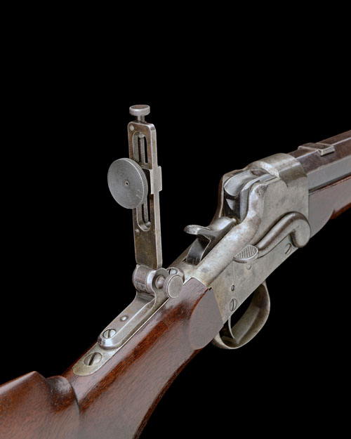 circa 1881, with heavy two-stage 30in. blued barrel signed 'REMINGTON ARMS CO. ILION N.Y.' and marked with the calibre, dove-tailed tunnel fore-sight, blanking plate to the rear-sight dove-tail, colour-hardened plain receiver (faded) marked 'HEPBURNS PAT OCTOBER 7th 1879, central hammer, top-tang mounted with vernier peep-sight, walnut smooth pistol-grip butt-stock with raised cheek-piece, iron 'shotgun' heel-plate, smooth walnut splinter fore-end with plated tip
