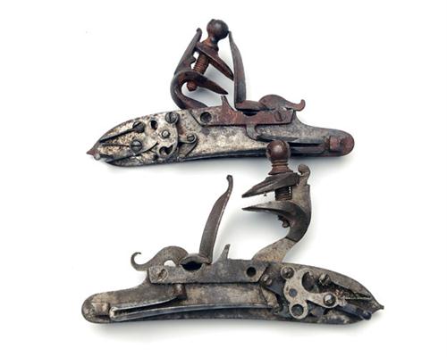 TWO DETACHED FLINTLOCK MECHANISMS, THE FIRST SIGNED 'W. GIBSON',