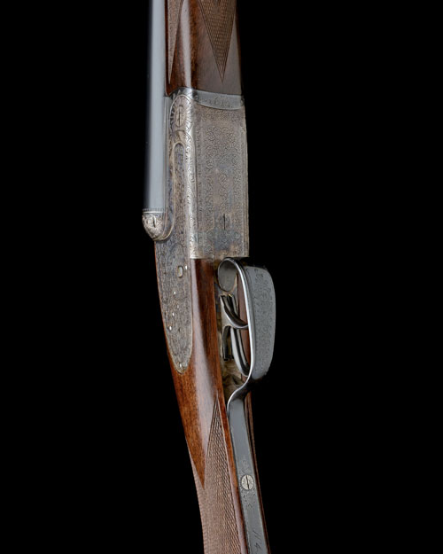 30in. nitro chopperlump barrels, 2 3/4in. chambers, bored approx. 1/4 and full choke, engraved arcaded fences, removable striker discs, automatic safety, gold-inlaid cocking-indicators, articulated front trigger, rolled-edge triggerguard, profusely engraved with acanthus scrollwork, retaining much original colour-hardening and finish, 15in. figured stock, weight 6lb. 2oz., with original certificate of proof