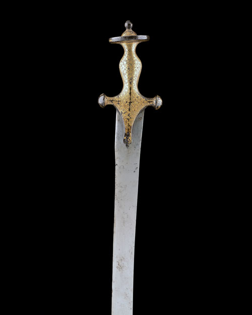 circa 1800, with slightly curving plain single-edged 30 1/2in. blade, iron hilt of typical form with disk pommel and symmetrical quillions, the entire hilt covered in fine gold koftgari arabesques (some losses to gilding, no scabbard)