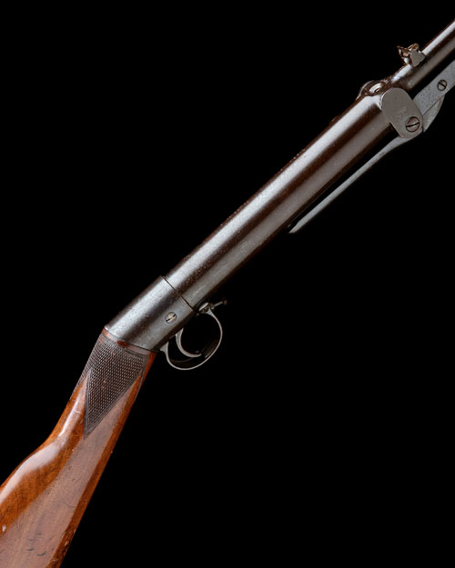 for 1913, with blued 17in. barrel, dove-tailed fore-sight, elevating rear-sight, plain blued air-chamber marked 'THE BSA AIR RIFLE (IMPROVED MODEL D), THE BIRMINGHAM SMALL ARMS CO. LTD. ENGLAND, SOLE MANUFACTURERS', blued trigger-housing, walnut butt-stock with chequered straight-hand grip, ribbed end to the butt and side-catch release for the under-lever, the whole retaining much original factory finish under light surface corrosion