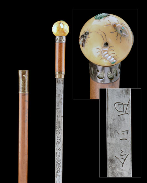 circa 1900, with 16in. single edged blade, false edged for the last 4 1/4in. and with a carved 'horimono' of an oriental dragon to the left hand side of blade with three naive Japanese characters engraved to the right, plain rounded wood hilt with brass ferrule to the front and pierced white-metal ferrule over ray-skin to the rear of grip, the pommel formed from a ivory ball inlet with carved insects formed from mother-of pearl, malachite and other semi-precious materials in 'shibayama' style COMPLETE WITH its plain wood scabbard with florally engraved brass locket and plain brass ferrule