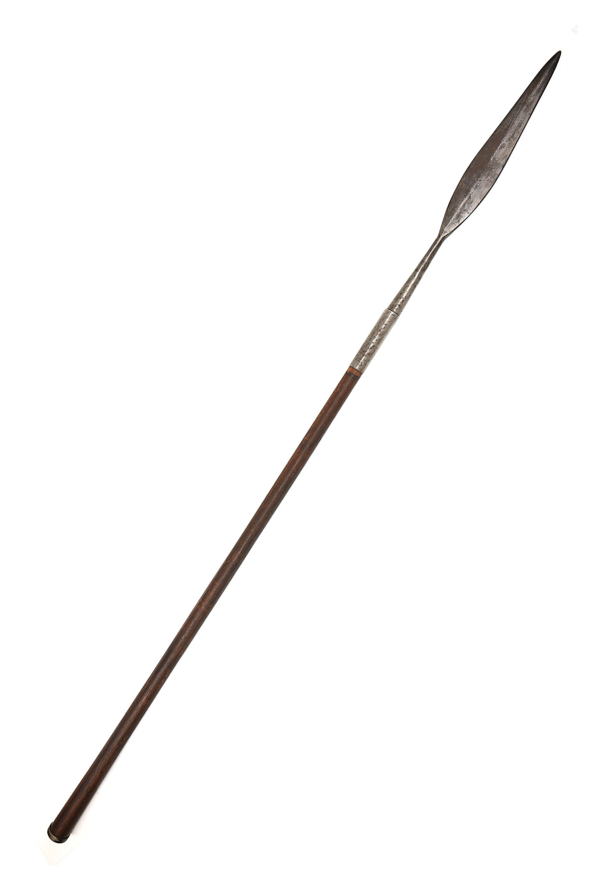A RARE WORLD WAR II SOUTH AFRICAN POLICE SPEAR, circa 1940s, with 13 1/2 in. steel blade with 9 1/2 in. lathe-turned socket faintly marked with a Broad Arrow, mounted on a hard-wood shaft with a metal base-cap, swollen at the base and with a thumb-groove, these spears were made in the UK for issue to native police in South Africa