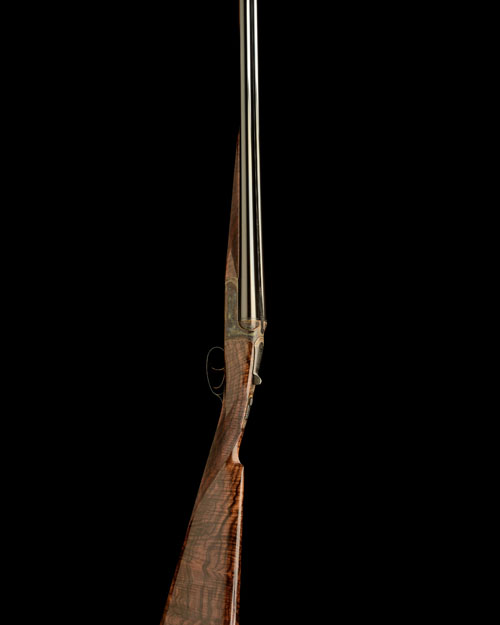29in. 2012 superior proof nitro chopperlump barrels with beaded line and scroll detailing at the breech end, rib engraved 'WESTLEY RICHARDS & CO. LTD. ENGLAND', 2 3/4in. chambers, Teague multichokes (with spares), scroll-back treble-grip action with model C dolls head, Westley Richards patent toplever, automatic safety with gold-inlaid 'SAFE' detail, hinged floorplate, John Deeley and H.B. Taylor 1897 patent detachable locks with scroll engraving and engine turned finish, rolled-edge triggerguard, profusely engraved with very fine acanthus scrollwork, the makers name inscribed in fine bold acanthus scrolling banners on a matt background, retaining virtually full original colour-hardening and finish, the triggerguard tang gold-inlaid with the serial number, 14 7/8in. highly-figured stock, fore-end with Deeley & Edge patent release catch and horn finial, the fore-end iron screws with fine beaded border and acanthus scroll detailing, weight 5lb. 10oz.