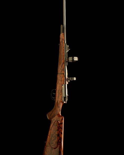 25 3/4in. fluted nitro barrel, barrel sight shroud finely engraved with floral and acanthus scroll designs, chequered open sights with gold-inlaid sight line and folding leaf sight, ramp-mounted bead fore-sight similarly embellished, the breech end gold-inlaid with the makers logo and calibre designation and mounted with fine floral and scroll-engraved telescopic sight rings in quickly-detachable mounts, bolt housing gold-inlaid with the Mauser details, model designation and 'DBP 1 205 423', quick-release take-down mechanism, set triggers, highly-figured pistolgrip stock with cheekpiece, sling eyes, steel pistolgrip-cap (with trap), horn finial, 14 7/8in. pull including 5/8in. rubber recoil pad