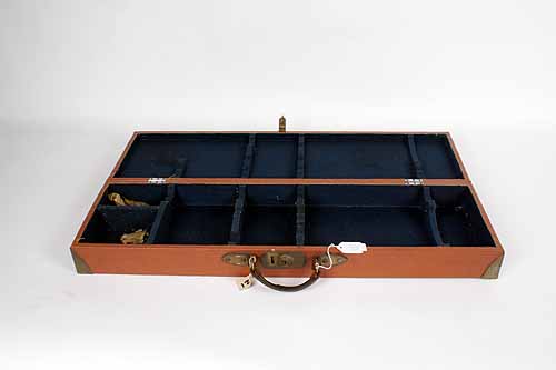 A BRASS-CORNERED HOMEMADE SINGLE LEATHERETTE GUNCASE, fitted for 30in. barrels, the interior lined with blue baize, brass lock (key missing)