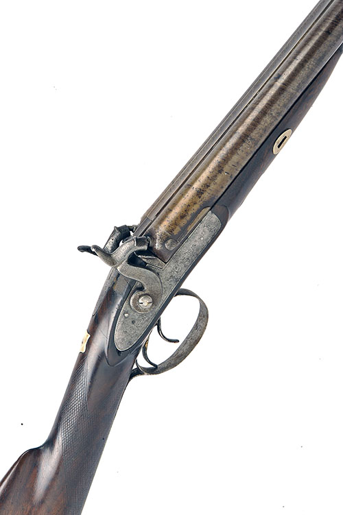A 12-BORE PERCUSSION DOUBLE-BARRELLED SPORTING-GUN, UNSIGNED, no visible serial number,