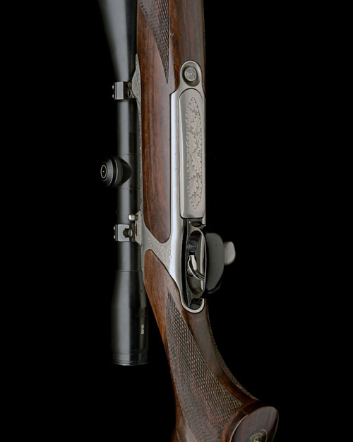 23 3/4in. nitro barrel with block-mounted open sights and ramp-mounted blade fore-sight, the receiver mounted with a Schmidt & Bender 8x56 telescopic sight in quickly-detachable mounts, bright finish with oak leaf motifs, detachable magazine with oak leaf engraved steel base, set trigger, highly-figured pistolgrip stock with cheekpiece, palm swell, quickly-detachable sling swivels, 14 1/8in. pull including 5/8in. ventilated rubber recoil pad