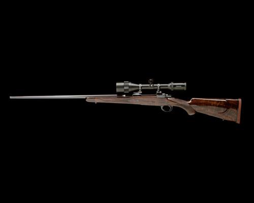 circa 1998, 26 1/8in. unsighted nitro barrel engraved in gothic script 'J. RIGBY & CO. LONDON. ENGLAND', the receiver ring engraved 'MADE IN ENGLAND' and with the calibre designation, the receiver mounted with a Swarovski PVI-2 4-16x50 telescopic sight, the rings engraved 'J. RIGBY & CO. LONDON' and 'CAL 6 5 X 68 NO. 6904', blued recoil block, hinged straddle floorplate with push button release, with gold-inlaid circular detail, gold-inlaid with the calibre designation and with central starburst design, blued triggerguard gold-inlaid with the serial number, highly-figured pistolgrip stock with cheekpiece, blued steel pistolgrip-cap, sling eyes, 14 1/2in. pull including 3/4in. rubber recoil pad