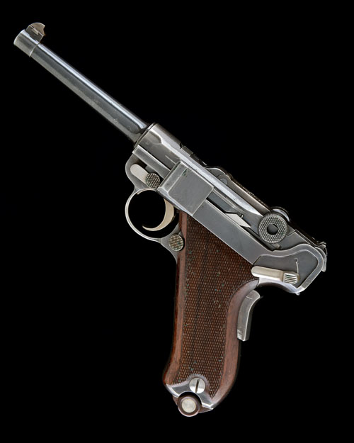 for 1933, with 4 3/4in. sighted barrel, blued receiver, blued toggle with knurled cocking-pieces, the top of toggle stamped with a Swiss cross over 'WAFFENFABRIK BERN', blued frame with grip-safety, chequered walnut grips, much original finish remaining including 'straw' to the ancillaries; COMPLETE WITH its leather service issue holster marked for 1922