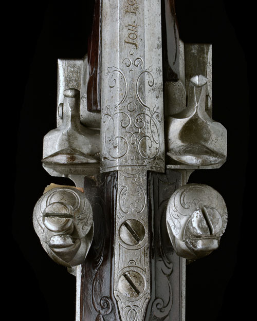 circa 1780, with octagonal 23in. slightly swamped barrels, the top-flat signed 'IOH LOBINGER IN WIENN', dove-tailed bead fore-sight situated within a scroll-engraved background, carved and engraved rear-sight with additional folding leaf, scroll engraving to the breech-end and top-tang, the bottom barrel with similar engraving but not fitted for sights, bevel-edged scroll engraved flat locks with lozenge pans; the right set higher than the left, engraved hammers and frizzens (some pitting), walnut full-stock deeply carved around the top-tang and forwards of and behind the raised cheek-piece, engraved brass rococo escutcheon to wrist, sliding patchbox to right hand side of butt with engraved brass mounts, engraved heel-plate, brass trigger-guard bow with wooden tang, integral thin walnut fore-end slats with engraved brass escutcheons for the three barrel-keys and wood ramrod mounted to the right hand side (loss to wood at right hand fore-end tip and forwards of left hand lock)